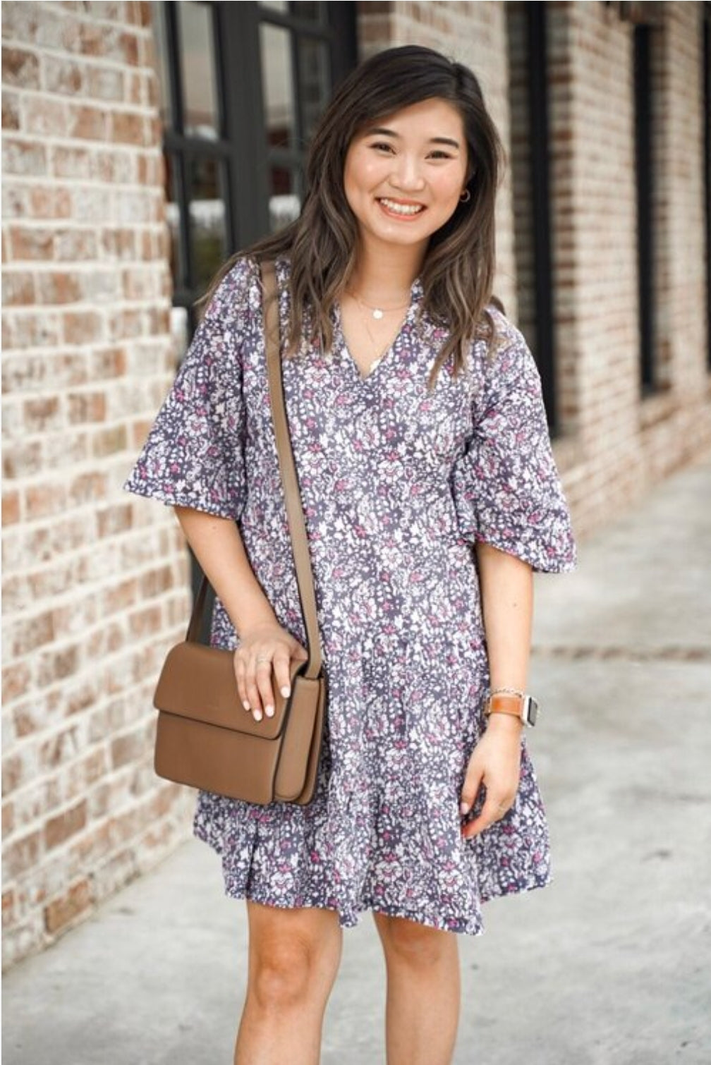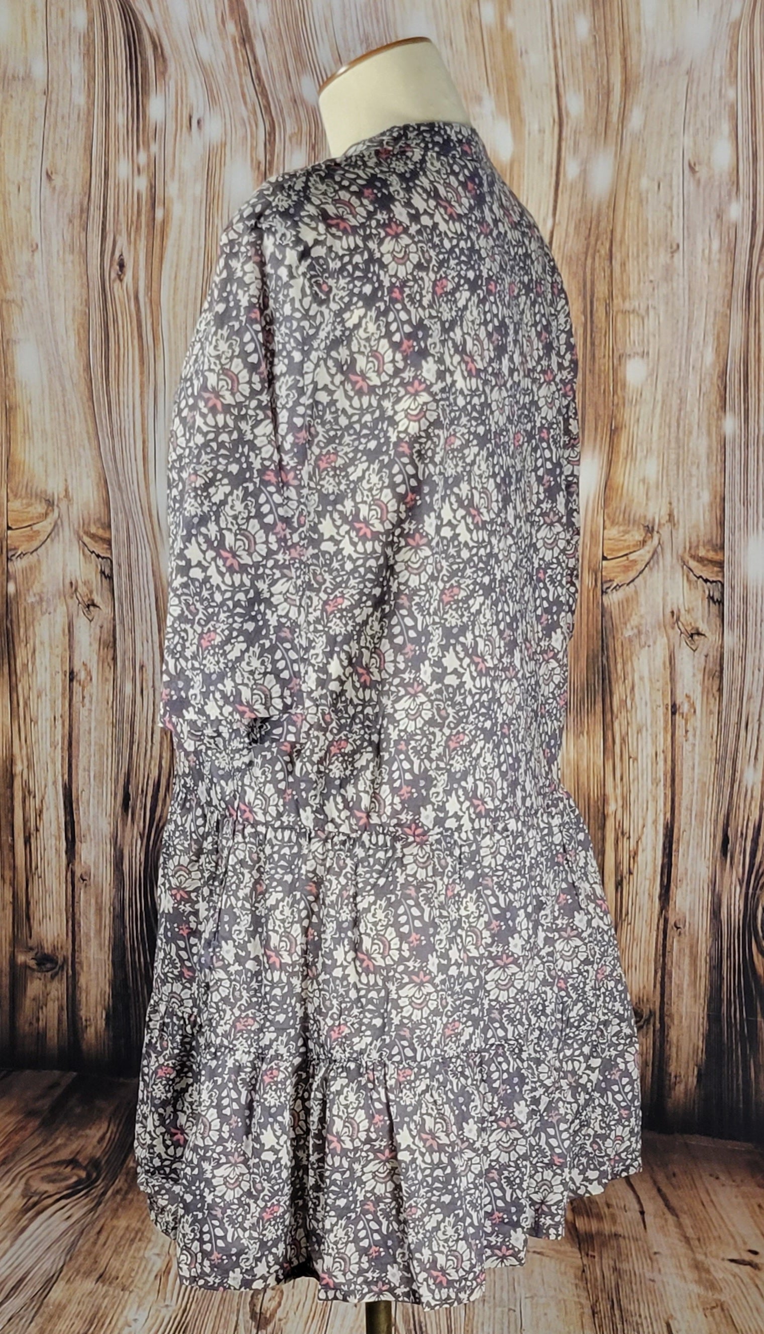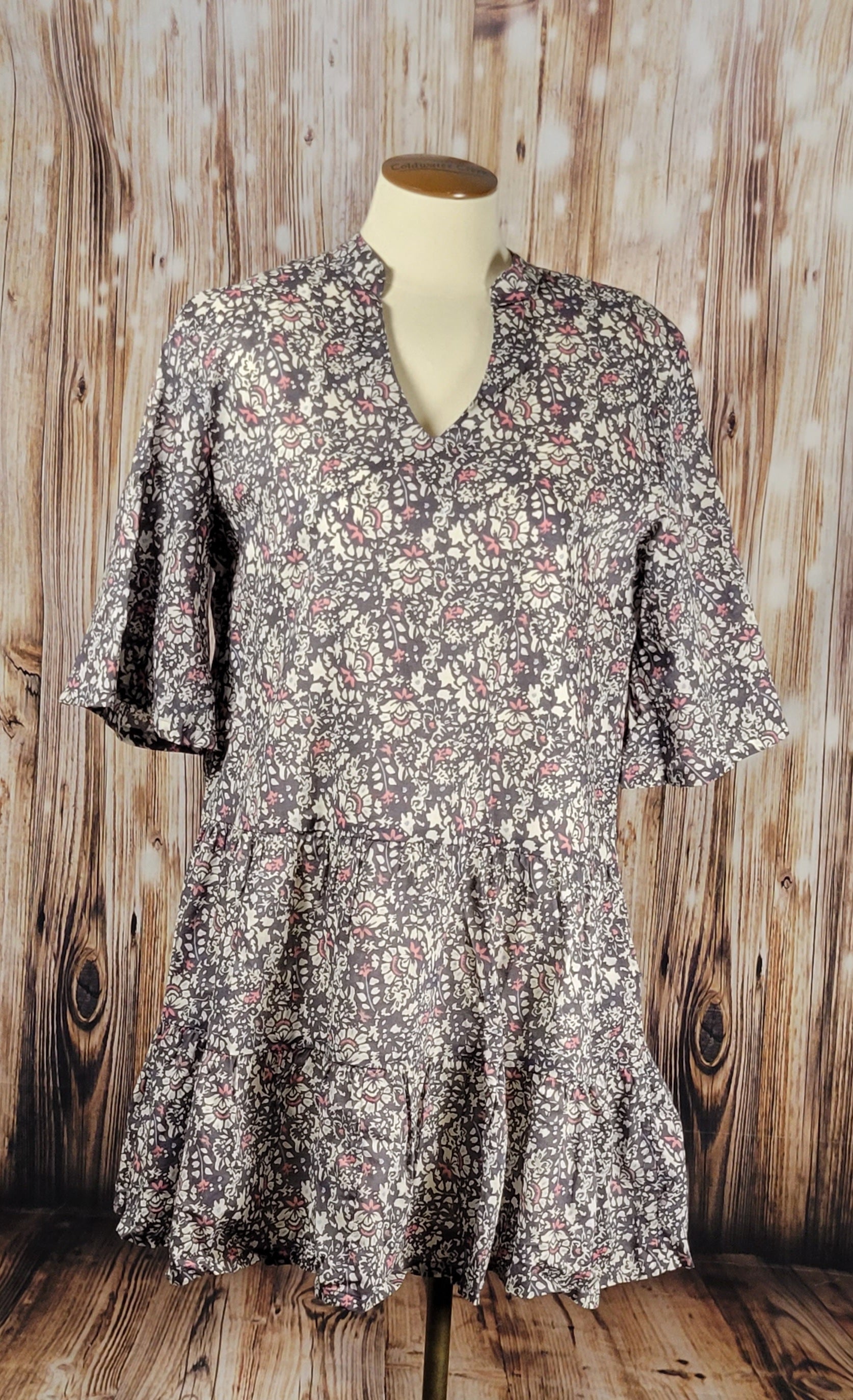 A pretty floral print in gray and pink, features a v-neckline, bell sleeves, and inner attached lining.