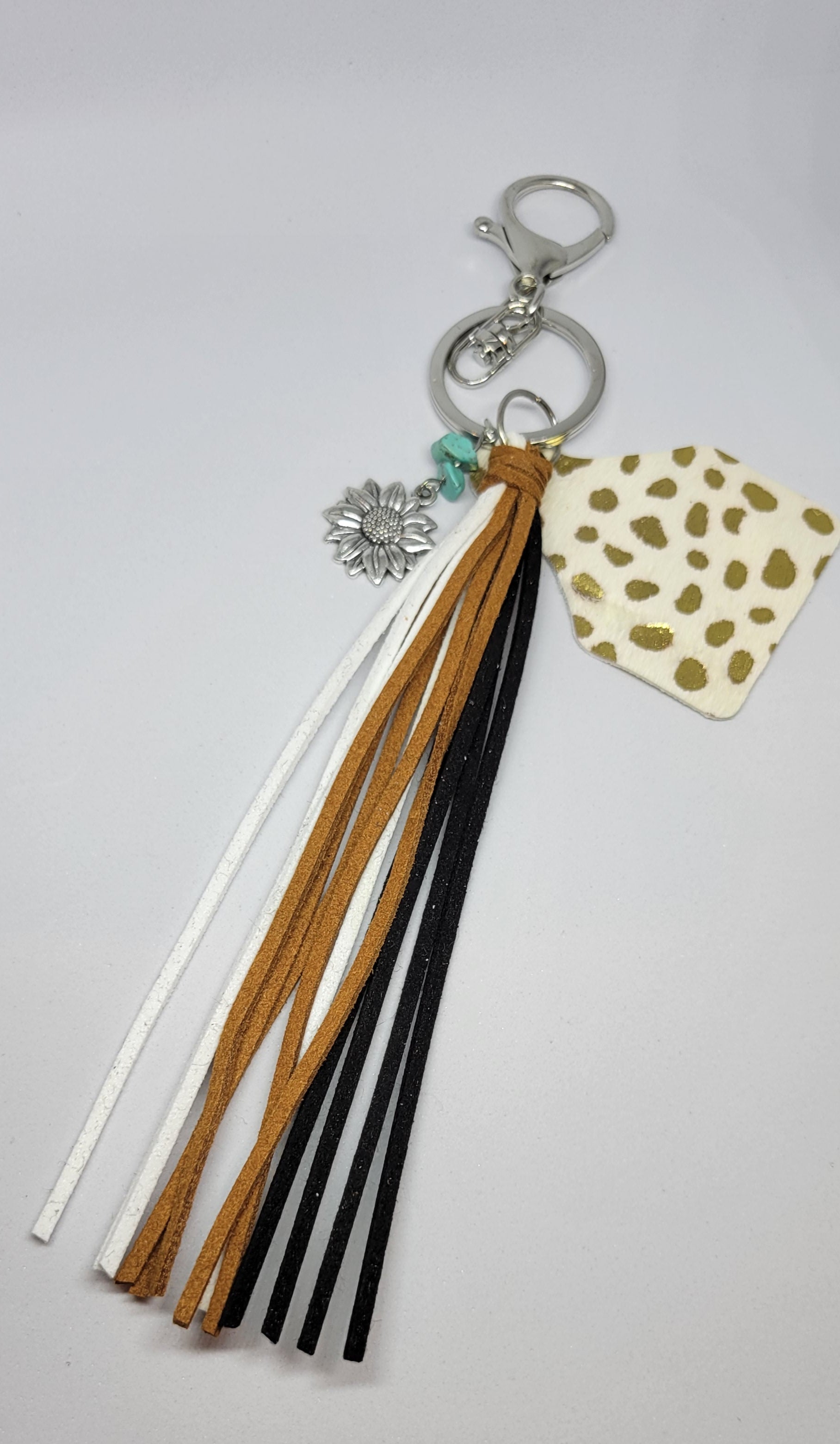 A Leather tag with gold spots and a sunflower charm with turquoise stones accent this Keychain with long Leather tassle.