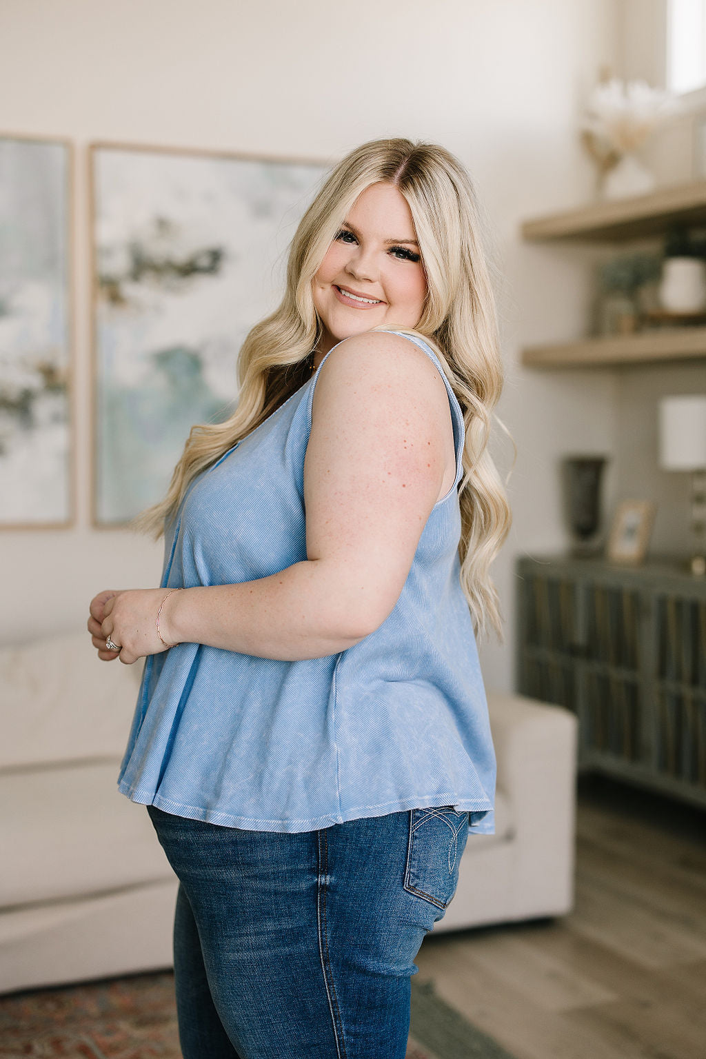 Step into summer style with the Swing Low Swing Tank! Designed with a scoop neckline front and back, it's crafted with corded ribbed knit for an ultra-comfy fit. Exposed center seams and a swing silhouette add visual interest, while the mineral washing process creates a soft hand feel. Effortless chic and unbeatable comfort!